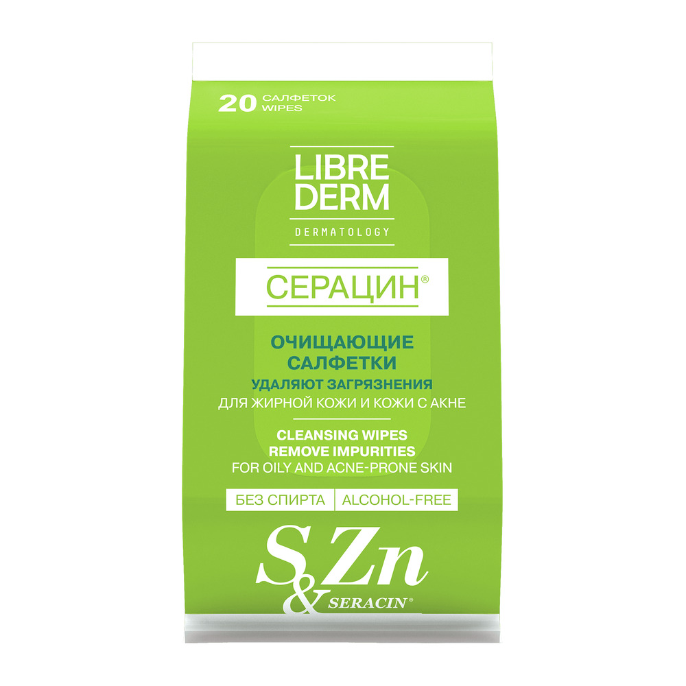 LIBREDERM Серацин влажные очищающие салфетки для жирной кожи и кожи с акне 20 шт | Влажные антибактериальные салфетки матируют и очищают кожу. | SERACIN | `00046182452 | `4620002187910 |
