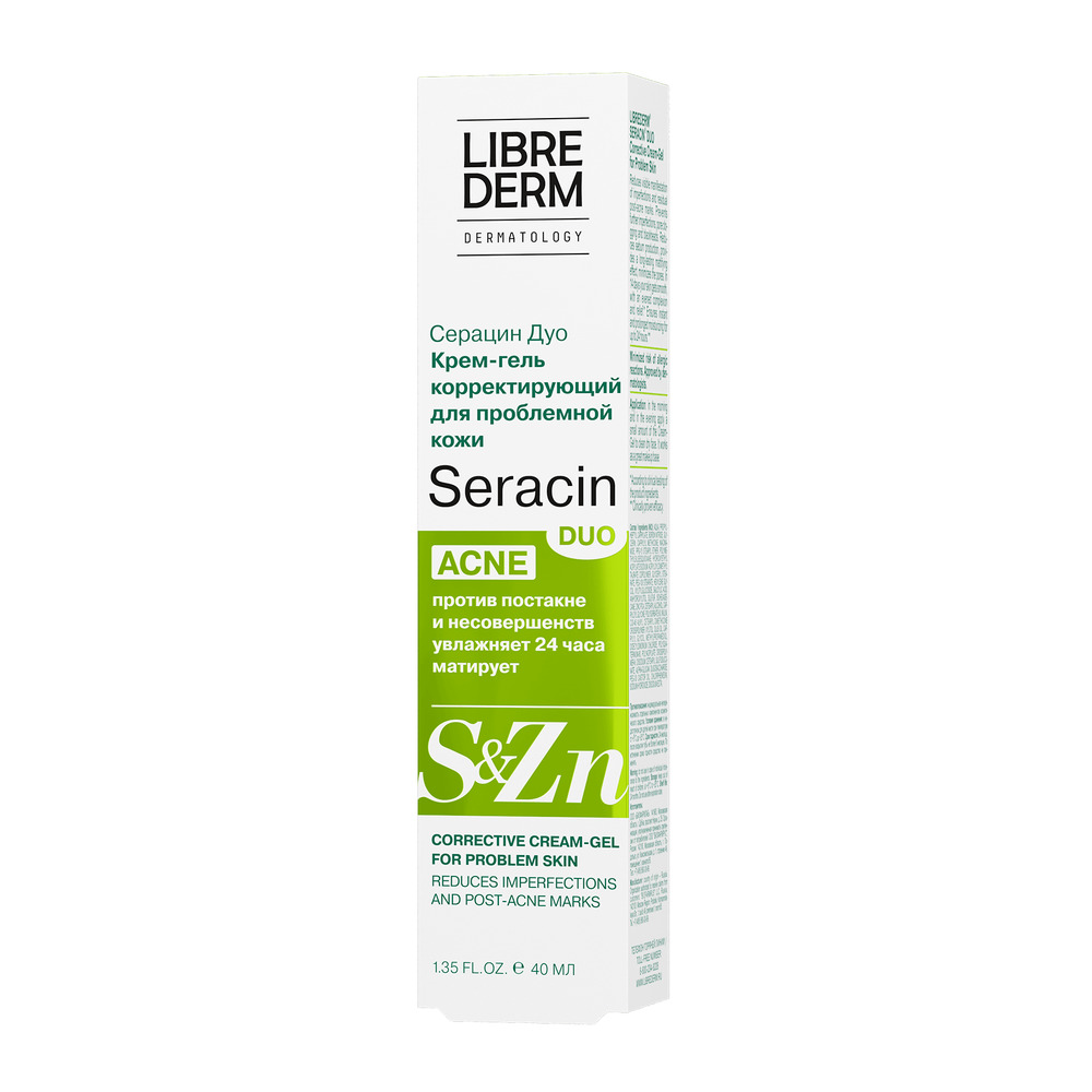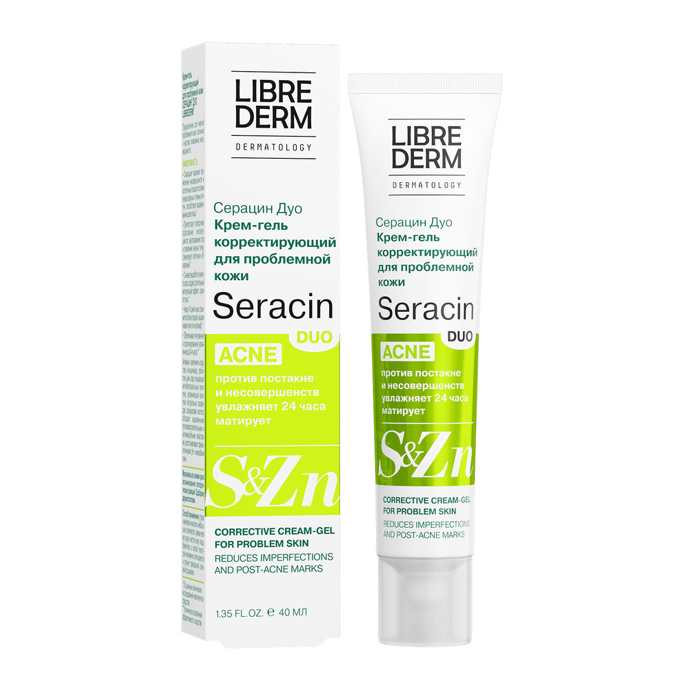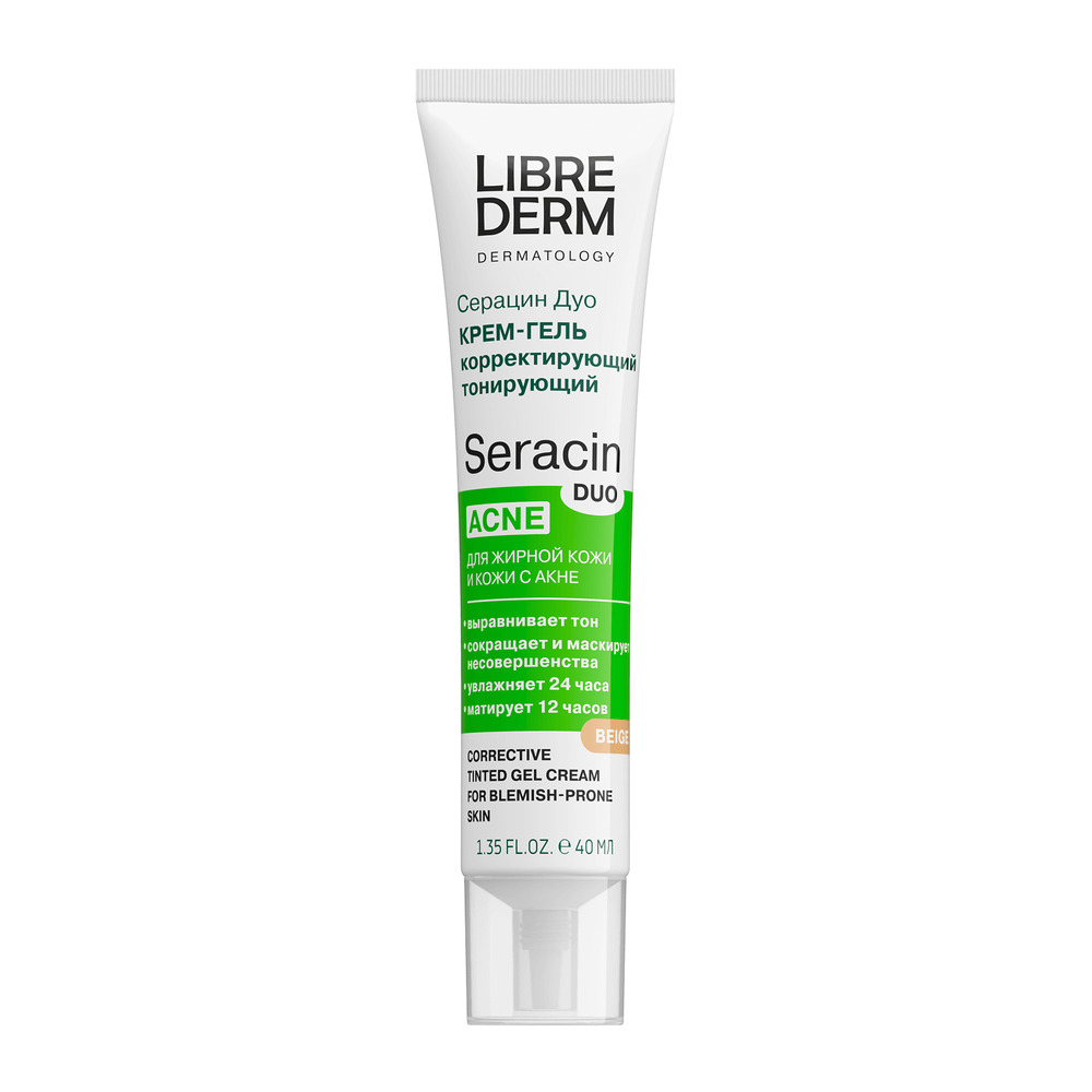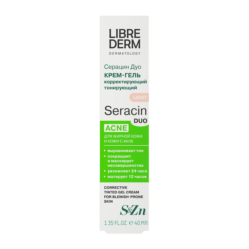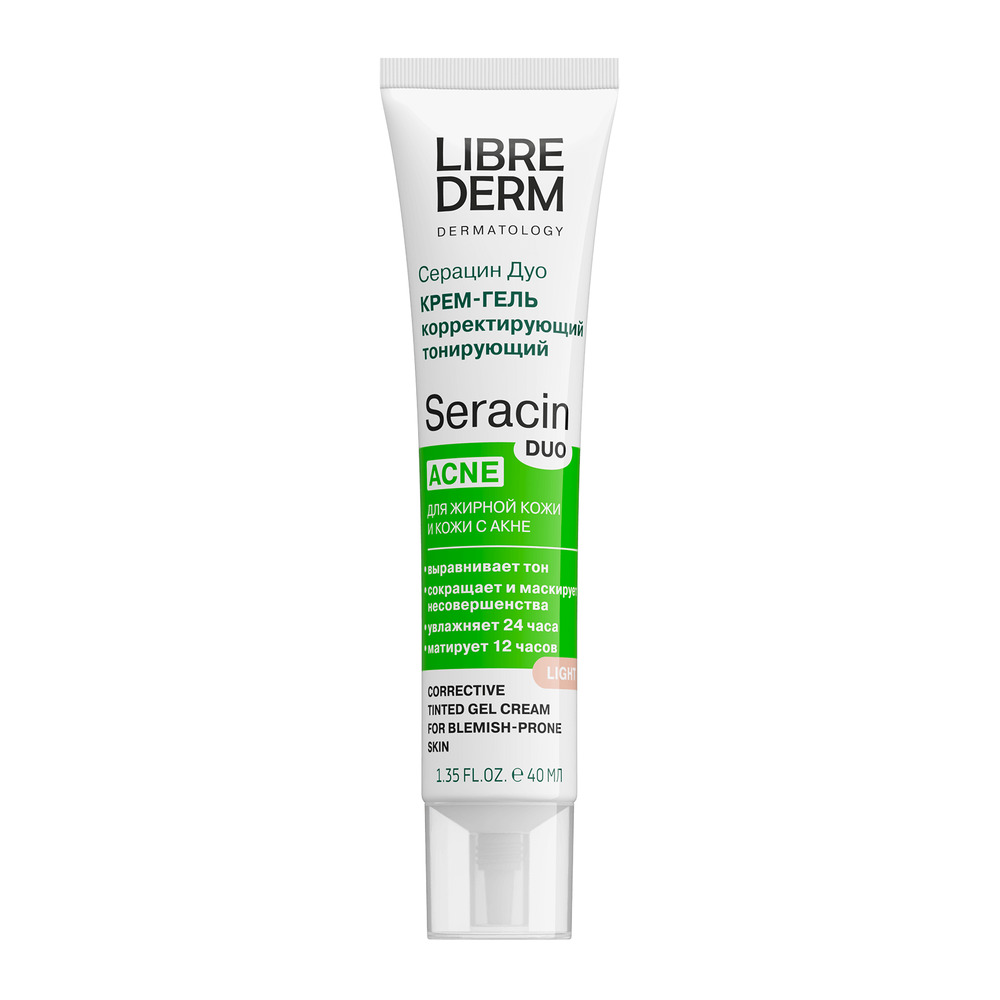 LIBREDERM Серацин ДУО крем-гель корректирующий тонирующий светло-бежевый тон 40 мл | Выравнивание тона кожи, увлажнение, сокращение несовершенств в виде акне, следов постакне, черных точек, расширенных пор, жирного блеска. | SERACIN | `00046202823 | `4630055169955 |