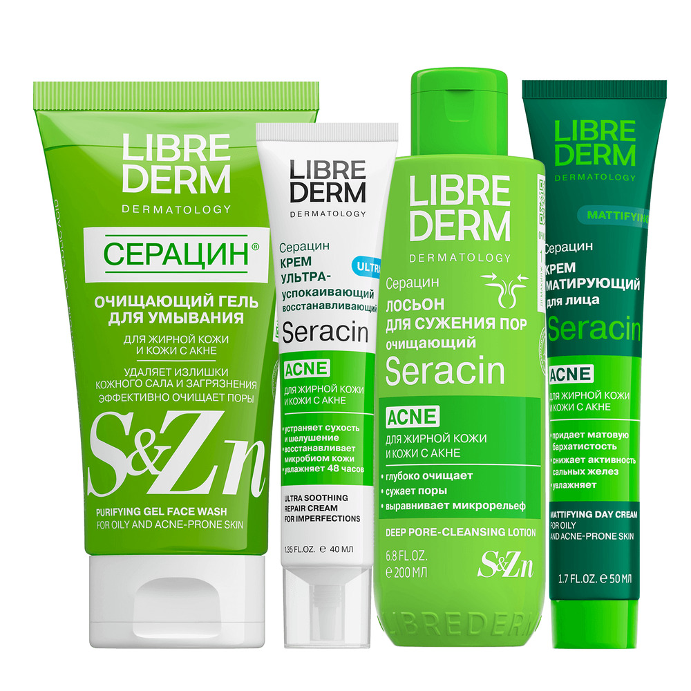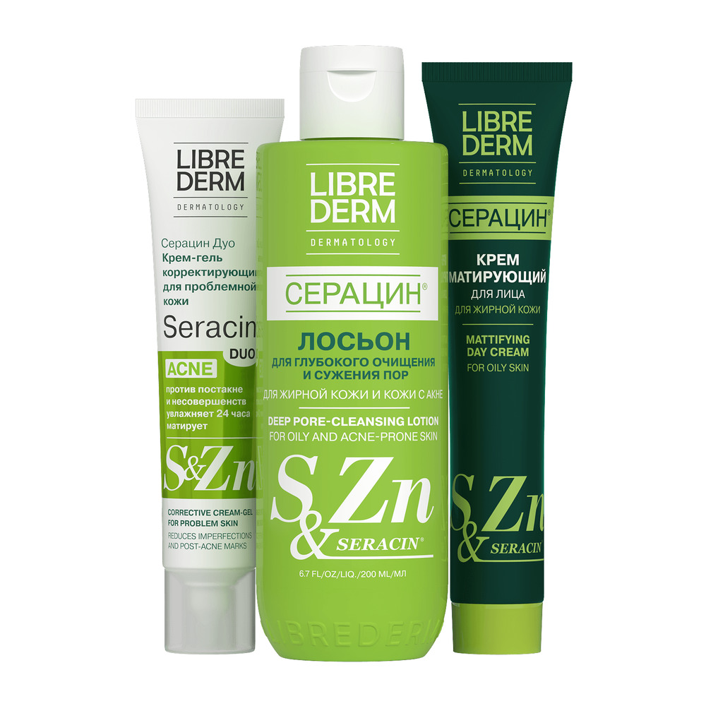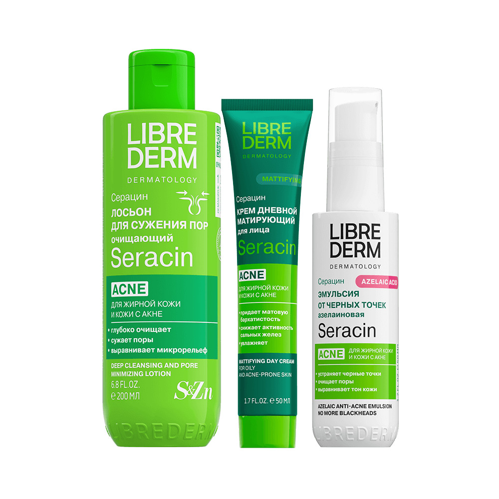 LIBREDERM набор Seracin «Детокс для пор» | Состав набора: Лосьон для глубокого очищения пор 200 мл Крем дневной матирующий 50 мл Эмульсия азелаиновая от черных точек антиакне 50 мл | SERACIN, SETS | `00046204798 | `4610216616269 |