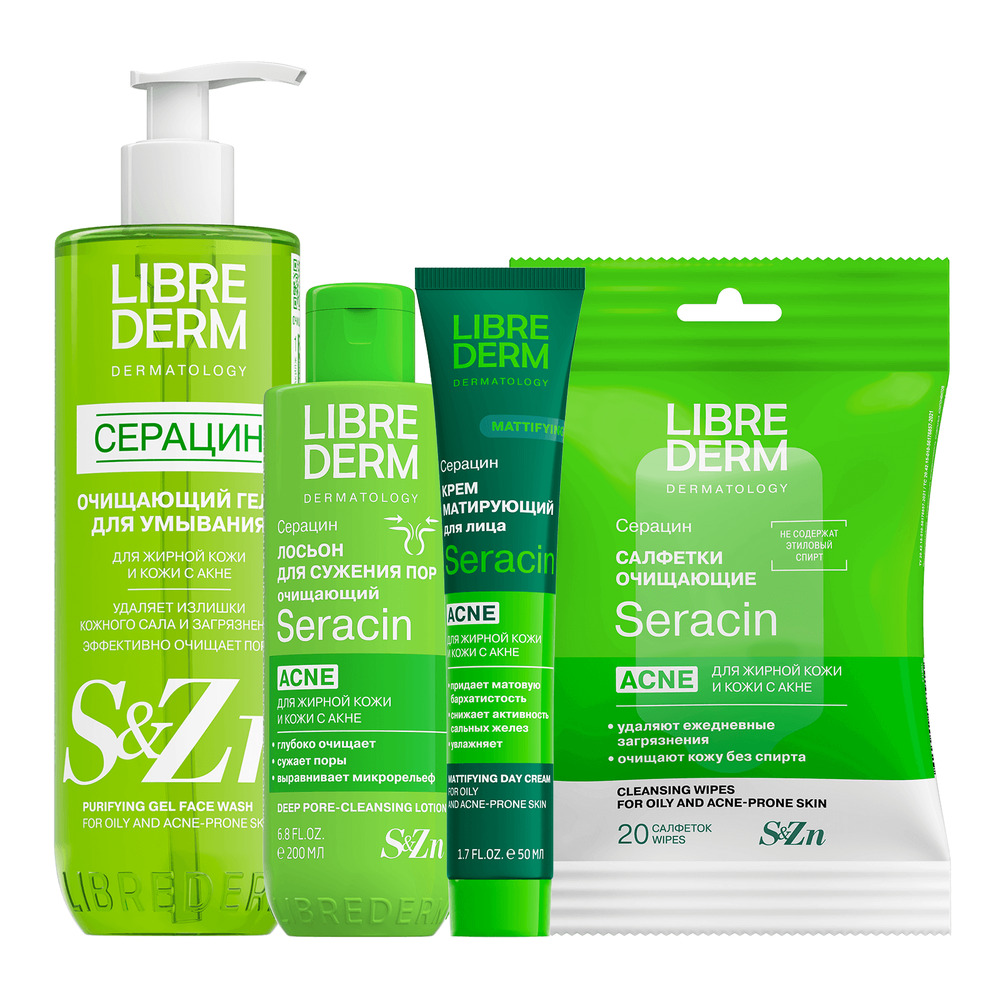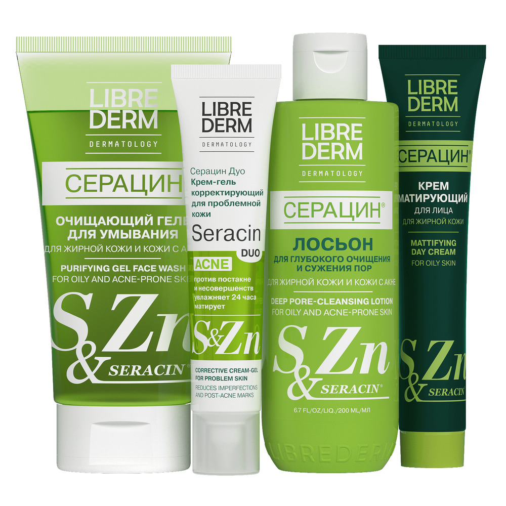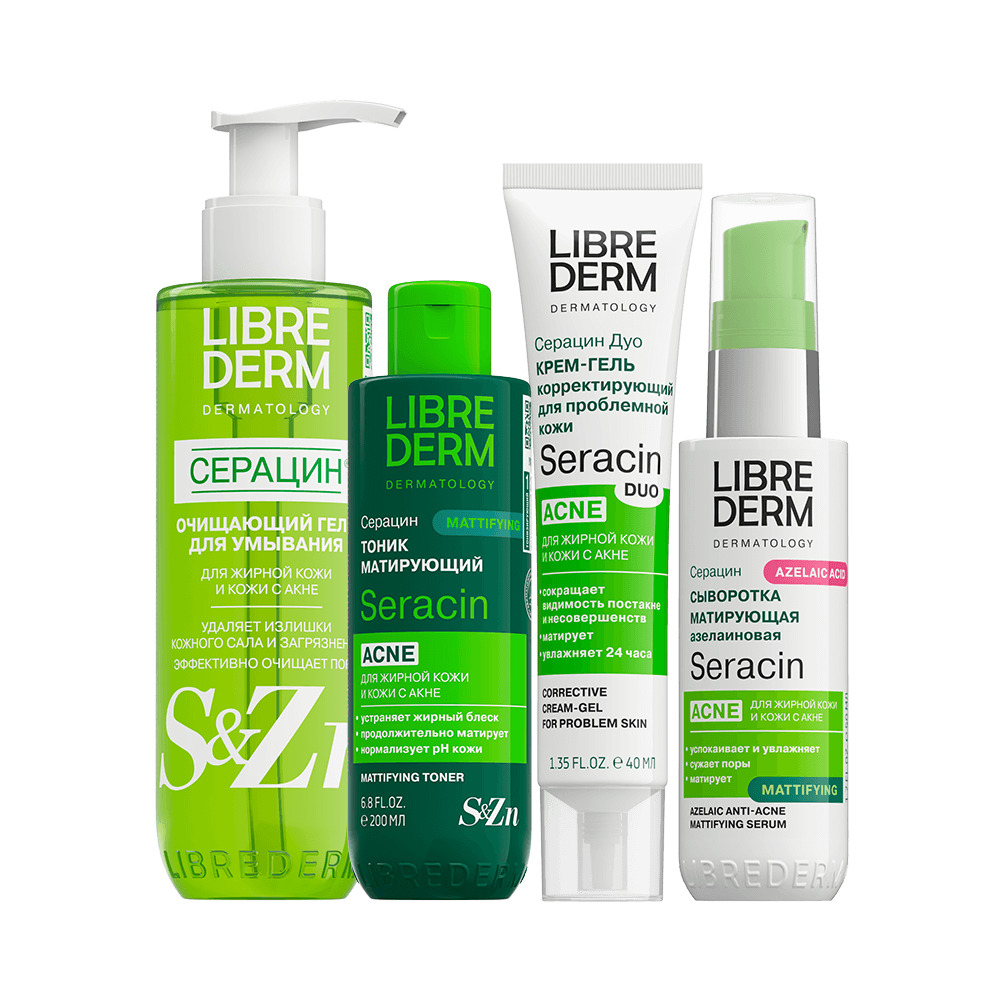 LIBREDERM набор Seracin «Протокол для жирной кожи» | Состав набора: Гель очищающий для умывания 200 мл ДУО крем-гель корректирующий для проблемной кожи 40 мл Тоник матирующий 200 мл Сыворотка азелаиновая матирующая антиакне 50мл | SERACIN, SETS | `00046204796 | `4610216616245 |