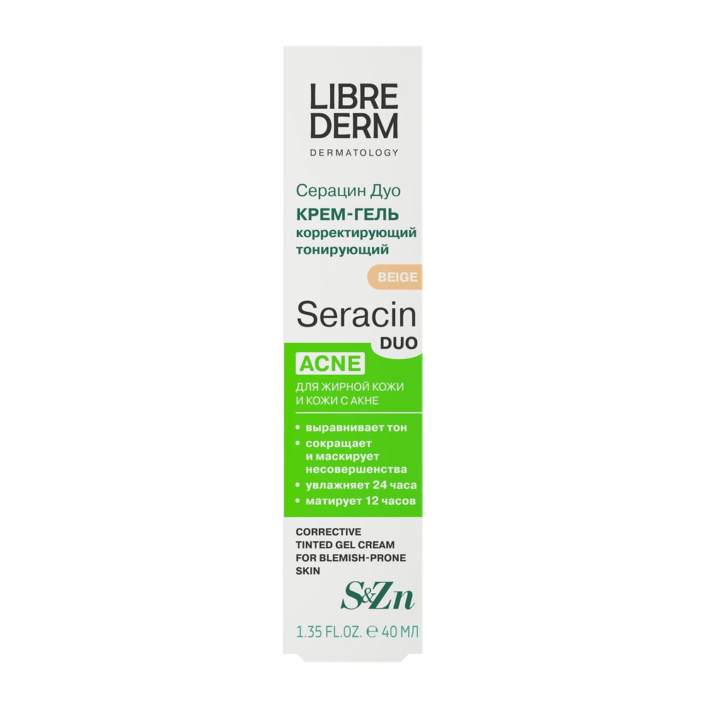 LIBREDERM Серацин ДУО крем-гель корректирующий тонирующий бежевый тон 40 мл | Выравнивание тона кожи, увлажнение, сокращение несовершенств в виде акне, следов постакне, черных точек, расширенных пор, жирного блеска. | SERACIN | `00046202822 | `4630055169948 |