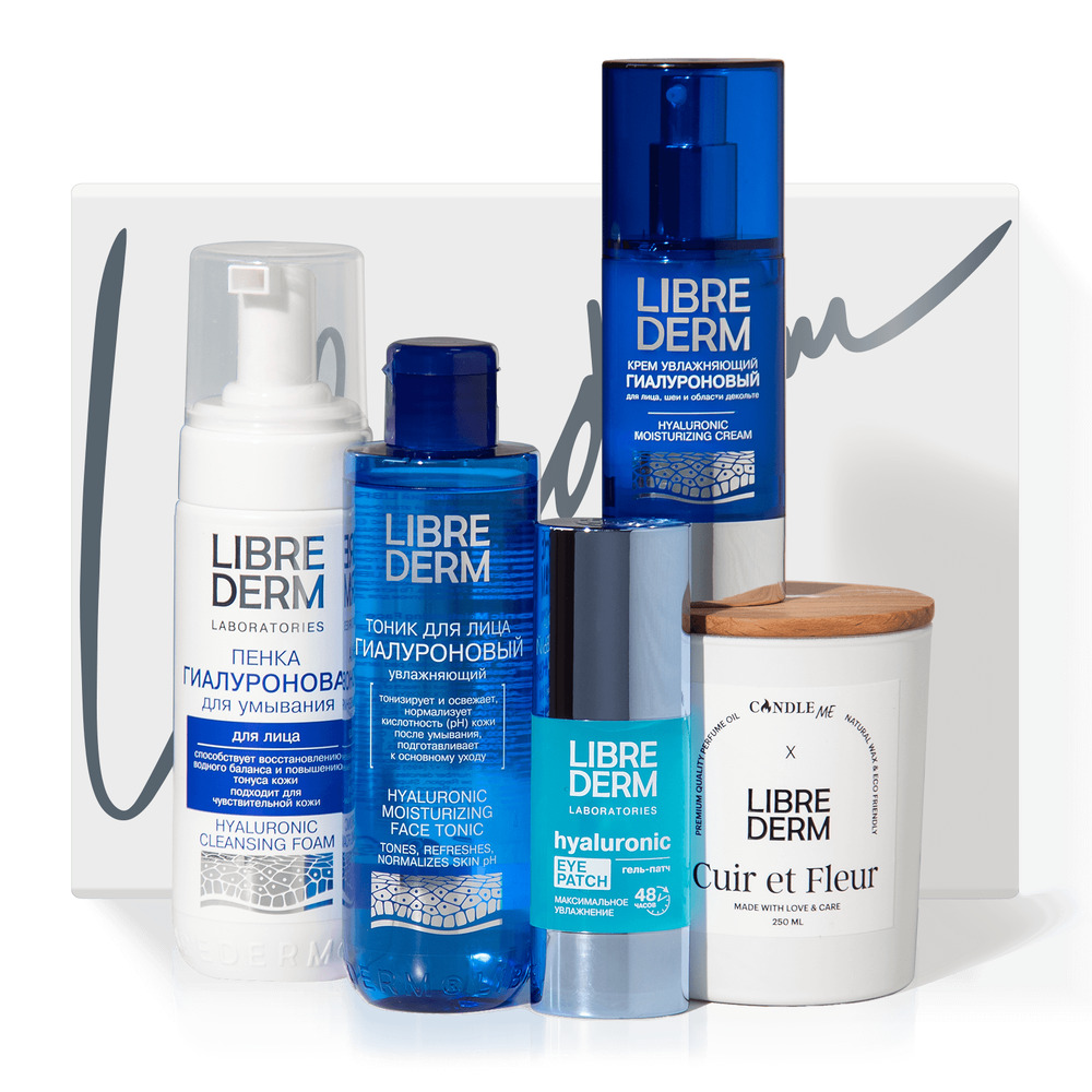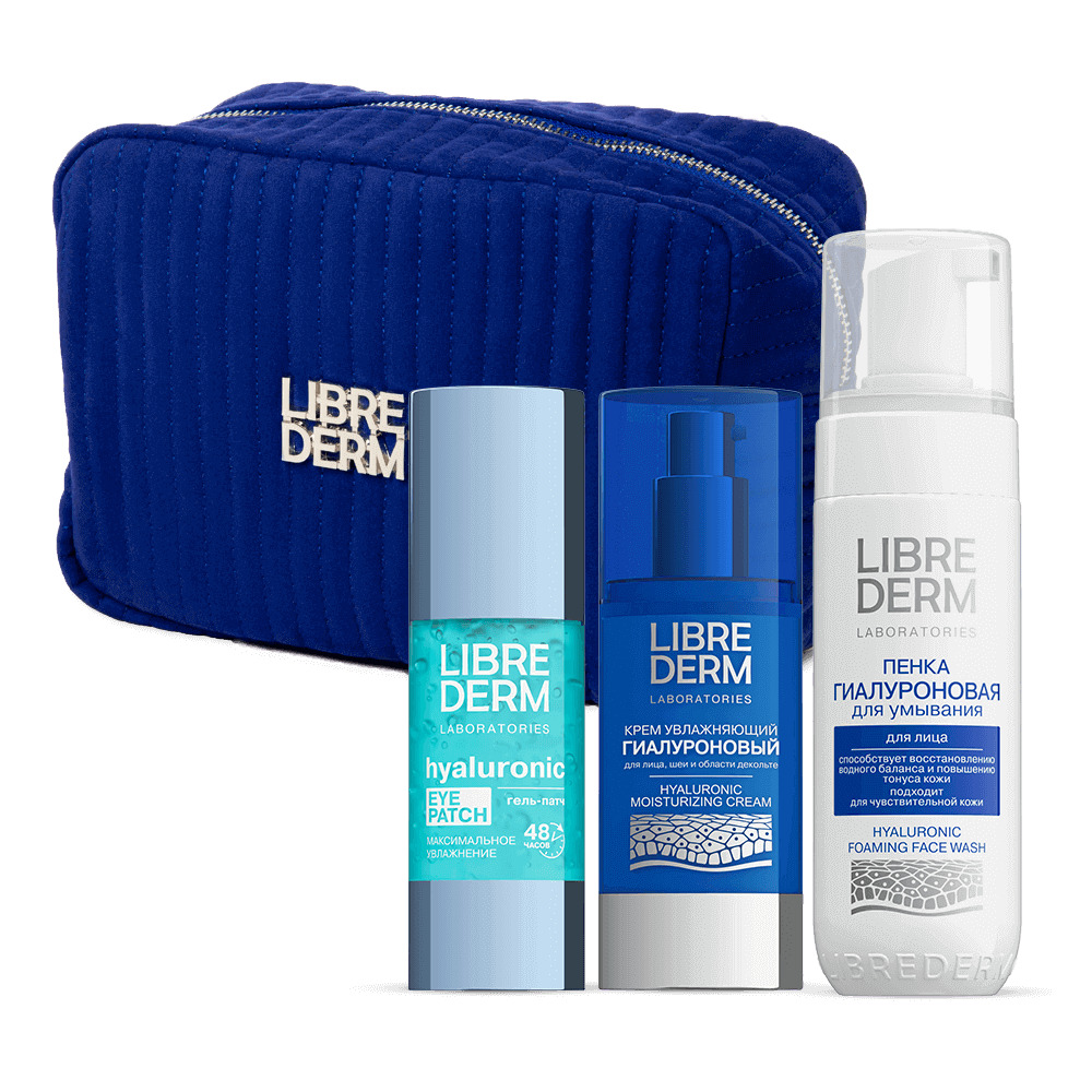 LIBREDERM набор Hyaluronic «Утренний Фреш» | Состав набора: Косметичка синяя вельветовая с серебряным логотипом LIBREDERM Гиалуроновый гель-патч для кожи вокруг глаз Максимальное увлажнение 30 мл Гиалуроновая пенка для умывания 160 мл Гиалуроновый крем увлажняющий для лица, шеи и области декольте 50 мл | SETS | `00046204808 | `4610216616344 |