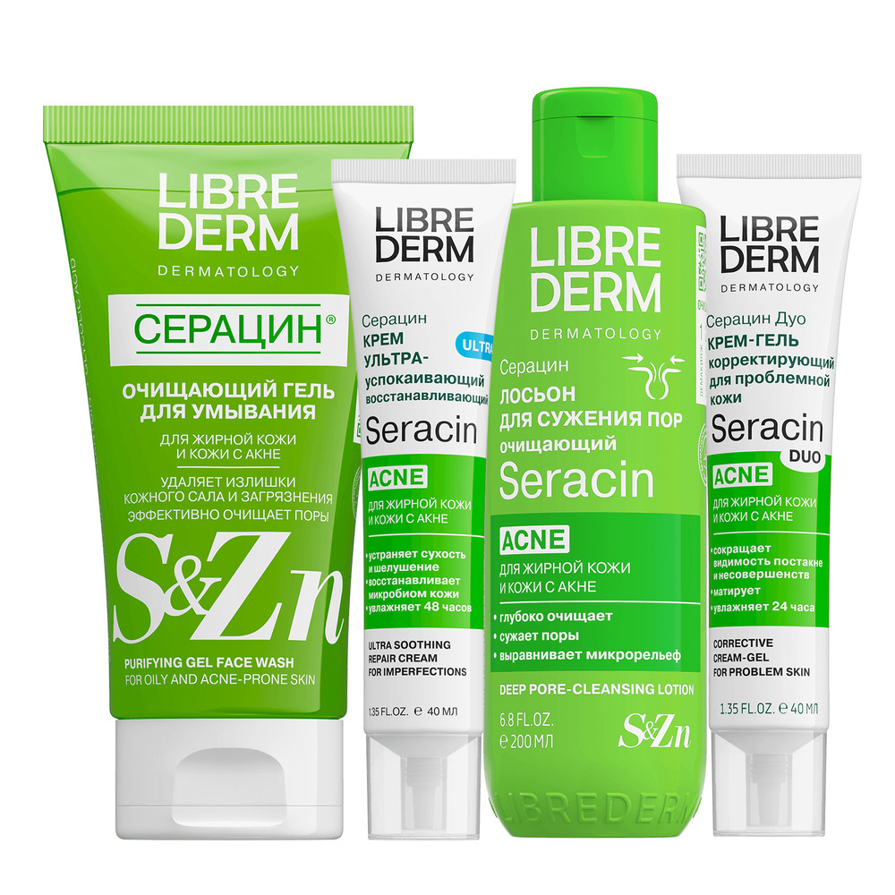 LIBREDERM набор Seracin «Постакне-Уход» | Состав набора: Серацин пенка деликатная для умывания 160 мл Серацин ДУО крем-гель корректирующий для проблемной кожи 40 мл Серацин сыворотка увлажняющая нормализующая с антирецидивным действием 50 мл Серацин крем ночной азелаин-форте 50 мл | SERACIN, SETS | `00046204795 | `4610216616238 |