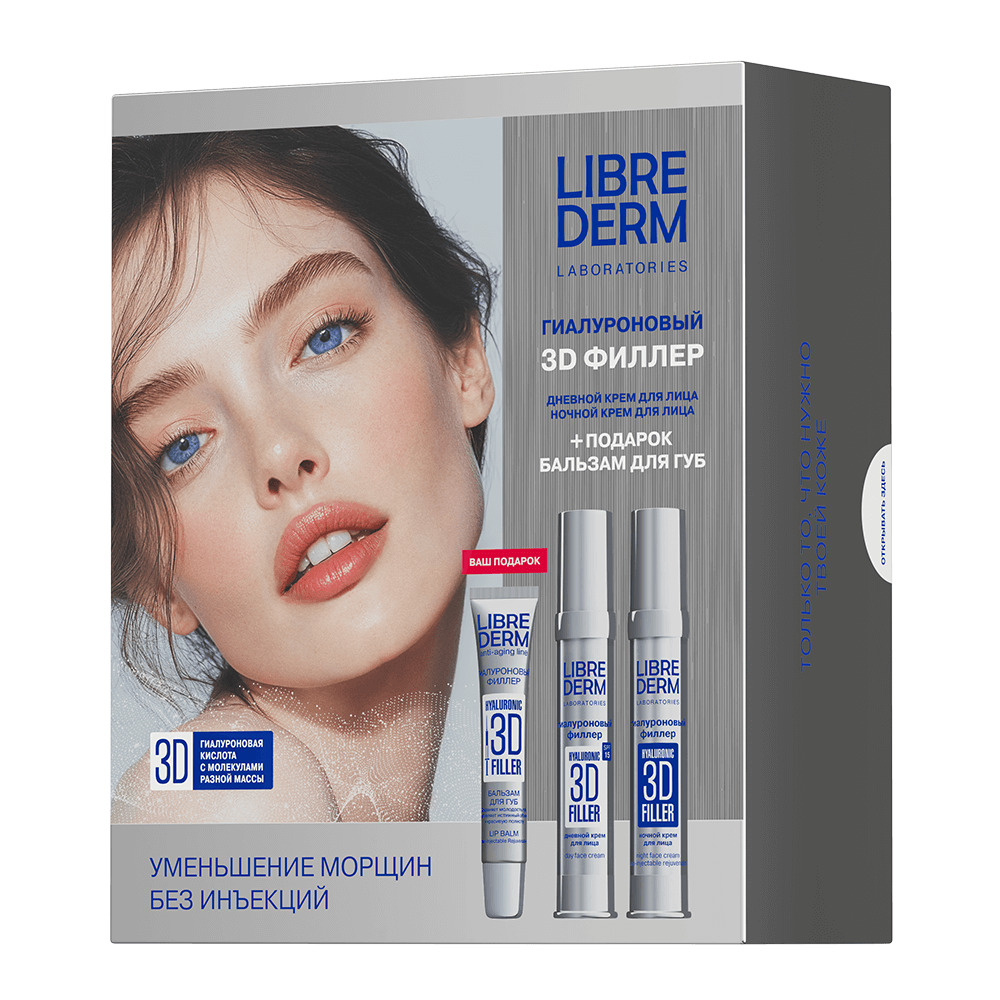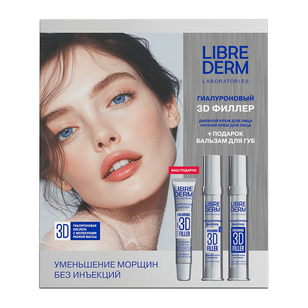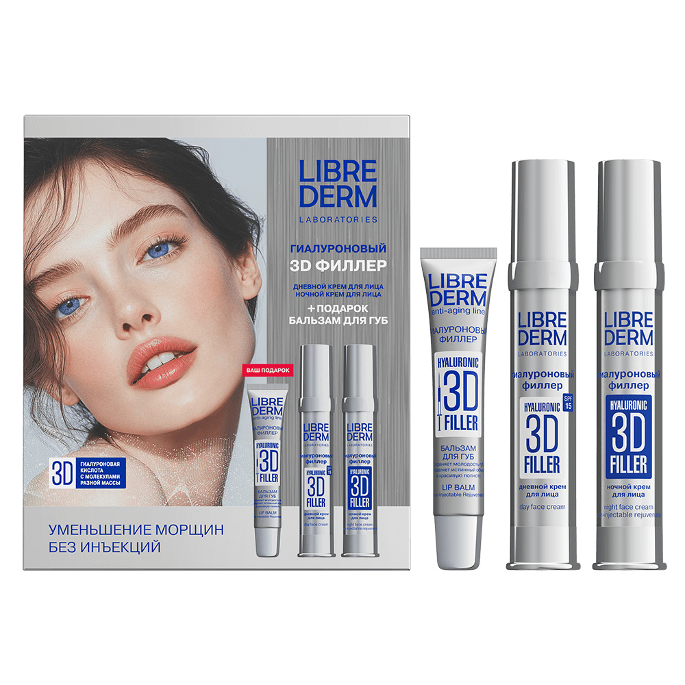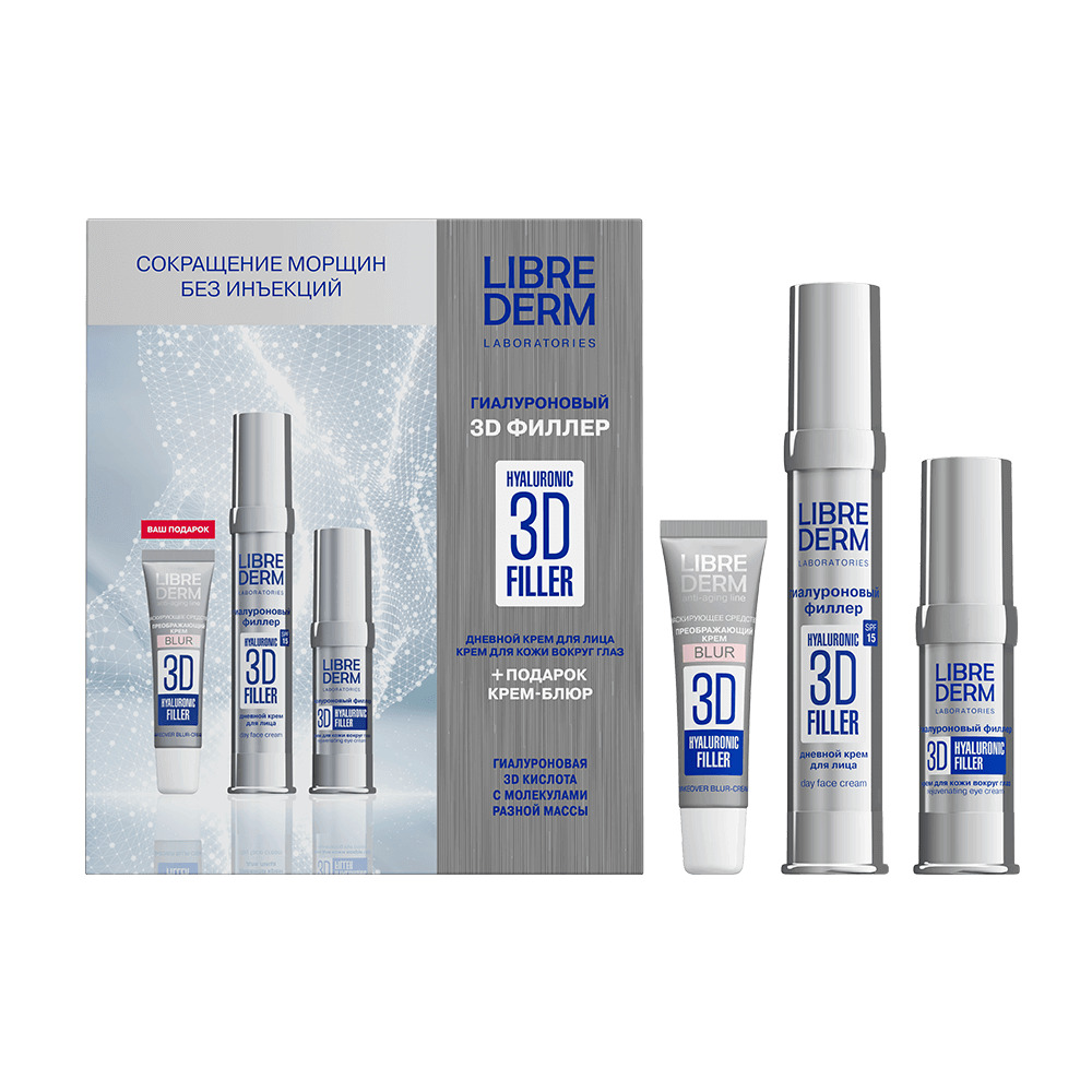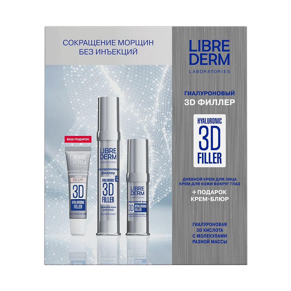 LIBREDERM набор 3D ФИЛЛЕР 3=2 "Сокращение морщин без инъекций" | Состав набора: 3D ФИЛЛЕРЫ крем дневной гиалуроновый для лица SPF 15 30 мл 3D ФИЛЛЕРЫ крем гиалуроновый для кожи вокруг глаз омолаживающий 15 мл ПОДАРОК! 3D ФИЛЛЕРЫ крем - BLUR гиалуроновый преображающий 15 мл | 3D FILLER, SETS | `00046204257 | `4610216612667 |