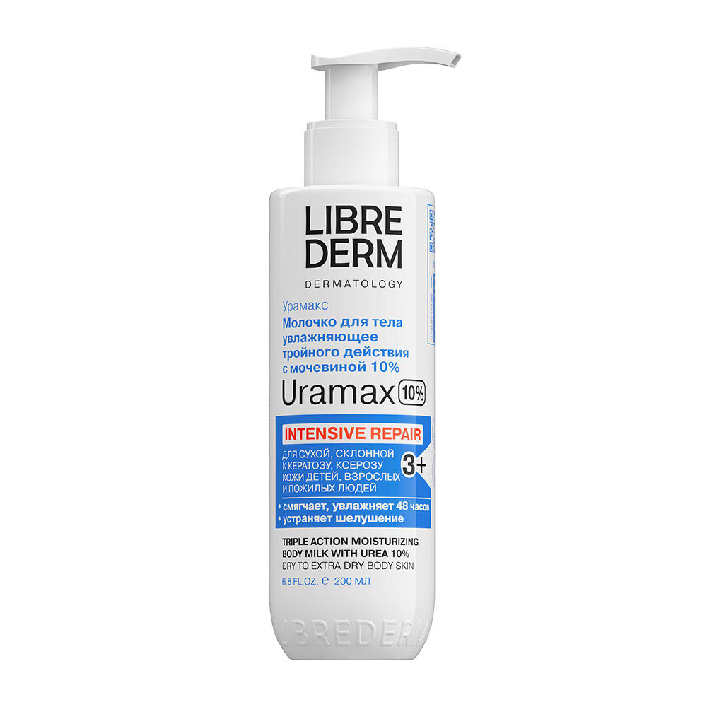 LIBREDERM URAMAX молочко для тела увлажняющее тройного действия с мочевиной 10% 200 мл | Интенсивный уход за сухой и очень сухой, склонной к кератозу, ксерозу и псориазу* кожей тела детей с 3-х лет, взрослых и пожилых людей. | URAМAX | `00046204364 | `4610216614265 |