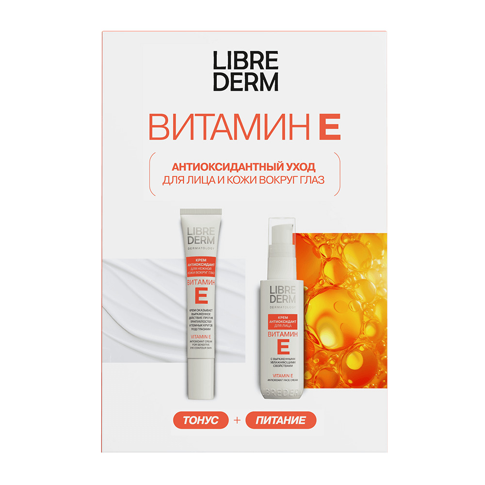 LIBREDERM Витамин Е набор Антиоксидантный уход для лица и кожи вокруг глаз | Состав набора: Витамин Е крем-антиоксидант для лица 50 мл Витамин Е крем-антиоксидант для нежной кожи вокруг глаз 20 мл | VITAMIN E, SETS | `00046204445 | `4610216614241 |