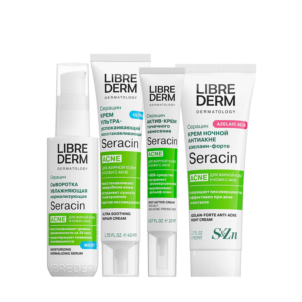 LIBREDERM набор Seracin «Протокол анти-акне» | Состав набора: Сыворотка увлажняющая нормализующая с антирецидивным действием 50 мл Крем ночной азелаин-форте 50 мл Крем ультрауспокаивающий восстанавливающий уход против несовершенств 40 мл Актив-крем точечного нанесения 20 мл | SERACIN, SETS | `00046204797 | `4610216616252 |