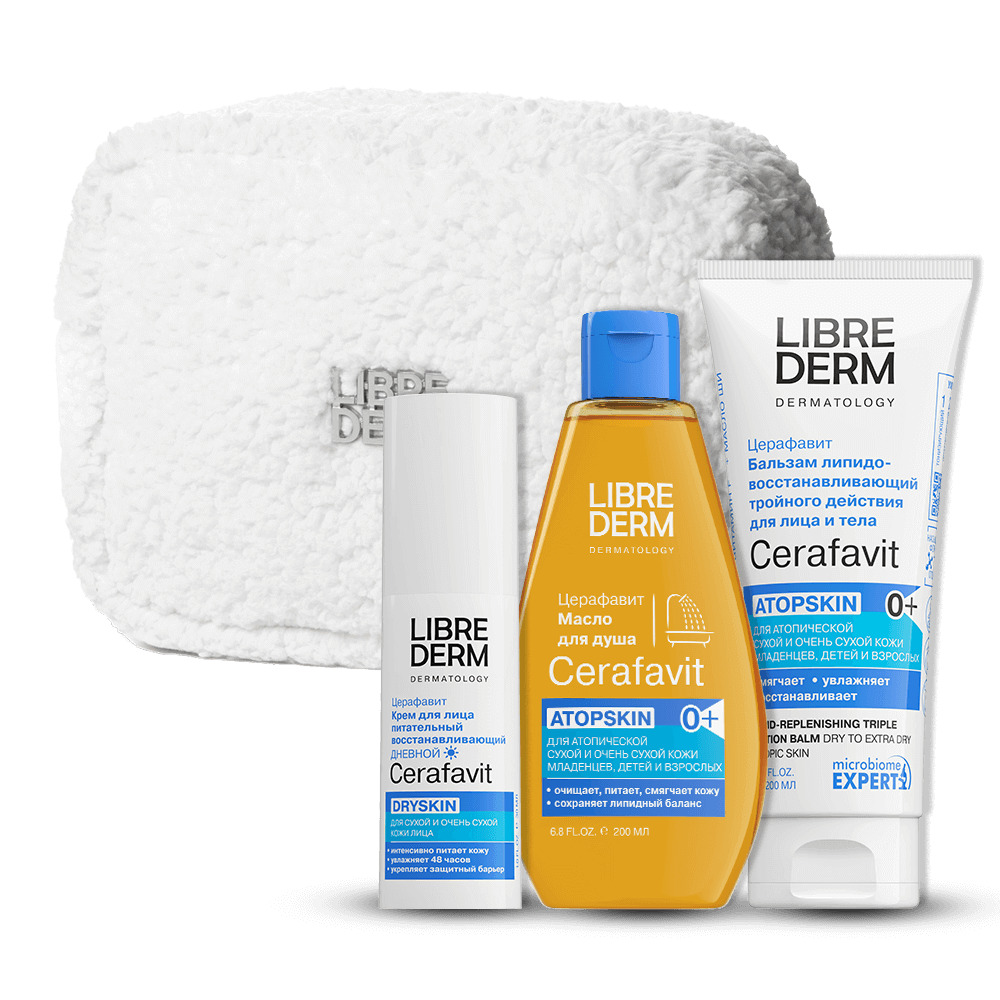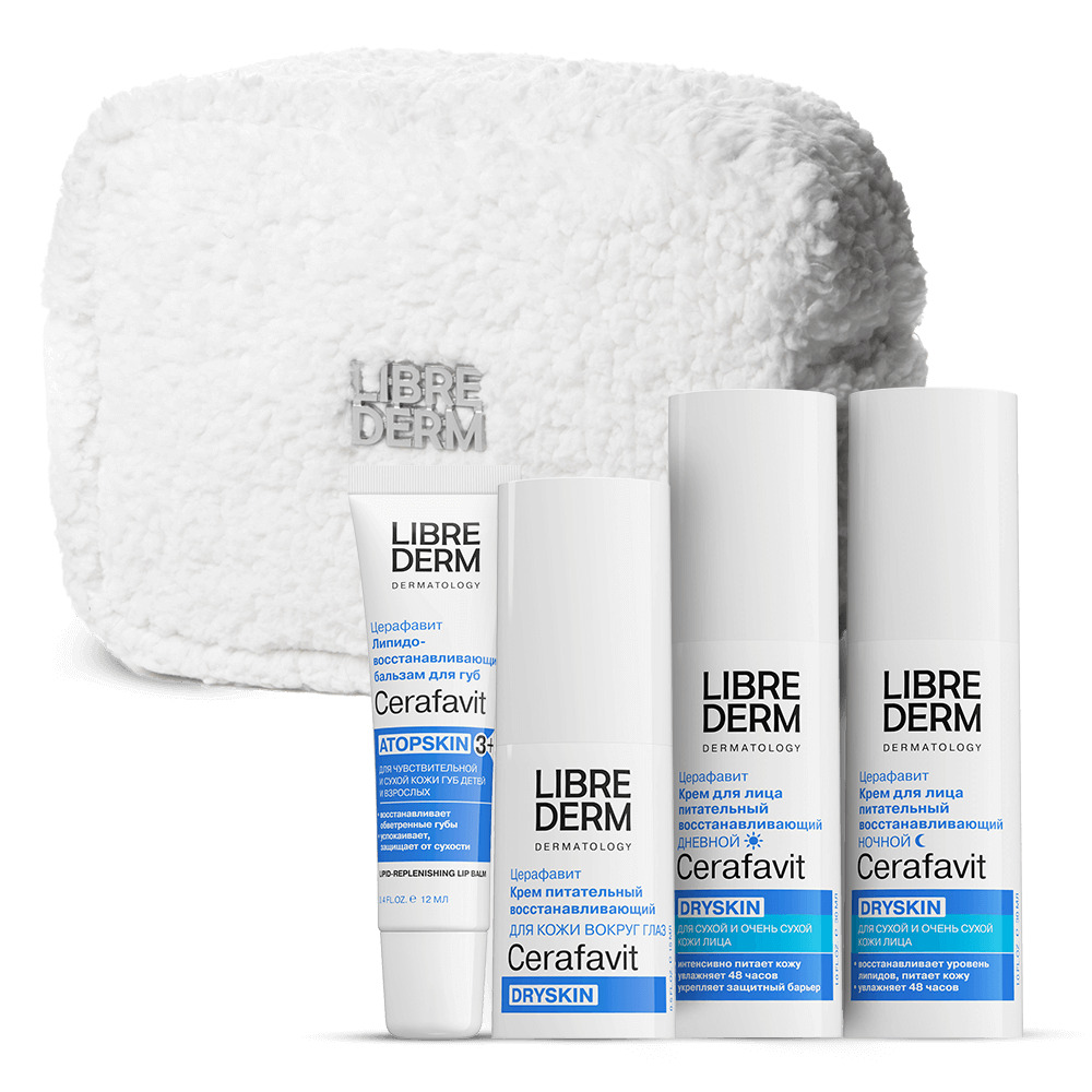 LIBREDERM набор CERAFAVIT «Комплексный уход для сухой кожи» | Состав набора: Косметичка белая плюшевая с серебряным логотипом CERAFAVIT крем питательный восстанавливающий дневной для лица 30 мл CERAFAVIT бальзам для губ липидовосстанавливающий с церамидами и витамином F 12 мл CERAFAVIT гель для душа успокаивающий с защитными свойствами для чувствительной кожи 200мл CERAFAVIT крем липидовосстанавливающий для очень сухой кожи рук 50 мл CERAFAVIT молочко для сухой и очень сухой кожи с церамидами и пребиотиком 200 мл | CERAFAVIT, SETS | `00046204805 | `4610216616313 |