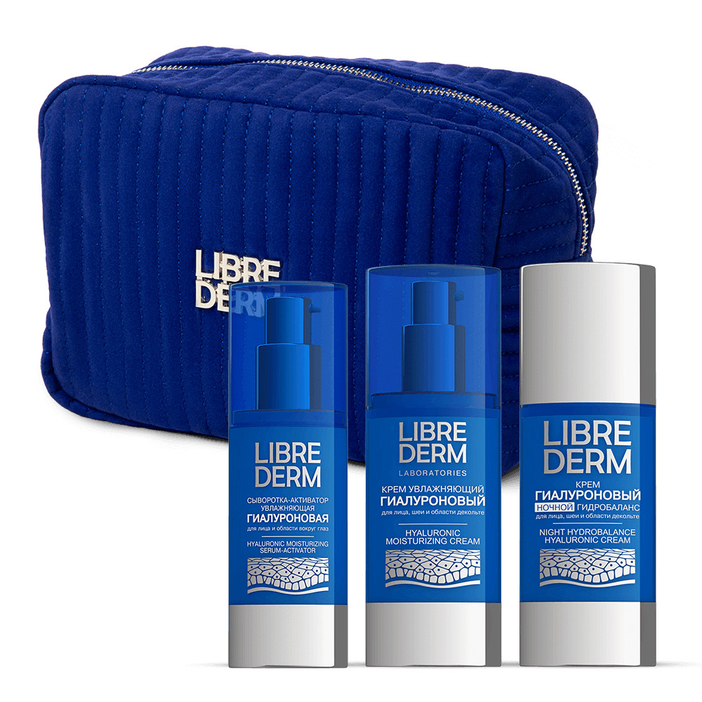 LIBREDERM набор Hyaluronic «Гиалурон Актив» | Состав набора: Косметичка синяя вельветовая с серебряным логотипом LIBREDERM Гиалуроновый крем увлажняющий для лица, шеи и области декольте 50 мл LIBREDERM Гиалуроновый крем ночной гидробаланс 50 мл LIBREDERM Гиалуроновая сыворотка-активатор увлажняющая 30 мл | HYALURONIC, SETS | `00046204807 | `4610216616337 |