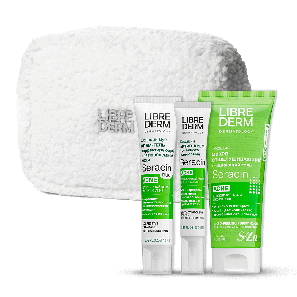 LIBREDERM набор Seracin «Акне контроль» | Состав набора: Косметичка белая плюшевая с серебряным логотипом Серацин актив-крем точечного нанесения 20 мл: Серацин ДУО крем-гель корректирующий для проблемной кожи 40 мл: Серацин гель микроотшелушивающий очищающий для кожи с выраженными несовершенствами 200 мл: | SERACIN, SETS | `00046204810 | `4610216616368 |