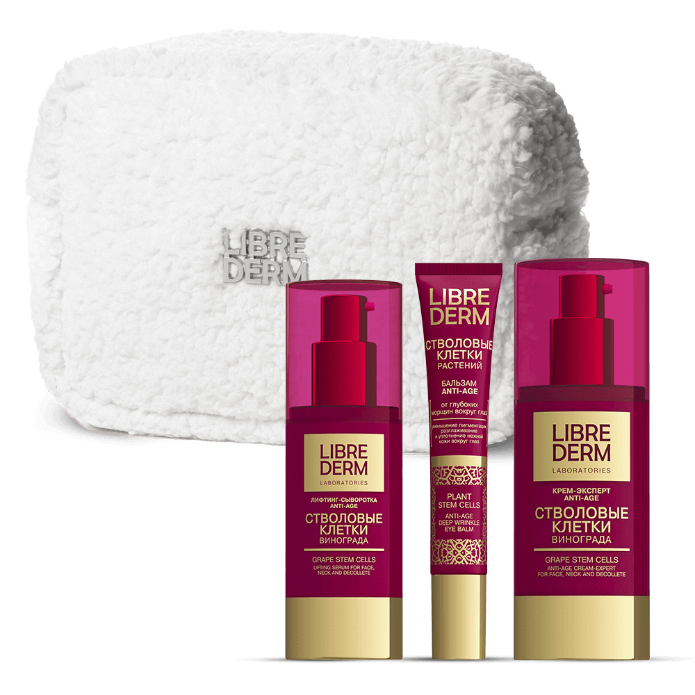 LIBREDERM набор Стволовые клетки винограда «Энергия Молодости» | Состав набора: Косметичка белая плюшевая с серебряным логотипом Стволовые клетки винограда лифтинг-сыворотка Anti-Age 30 мл Стволовые клетки растений бальзам от глубоких морщин вокруг глаз Anti-Age 20 мл Стволовые клетки винограда крем-эксперт Anti-Age 50 мл | STEM CELLS, SETS | `00046204812 | `4610216616382 |